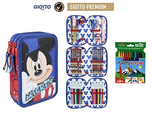 Plumier trousse triple avec accessoires Mickey Mouse 43 pièces. Contenu Giotto – rang plus cadeau de 1 boîte de 12 cire Alpino plastialpinoPlumier 3 étages avec 43 accessoires : 1 crayon 1 crayon à papier HB 17 Crayons de couleurs 18 marqueurs Giotto 1 taille-crayons 1 gomme 1 règle 1 ciseaux 1 fiche