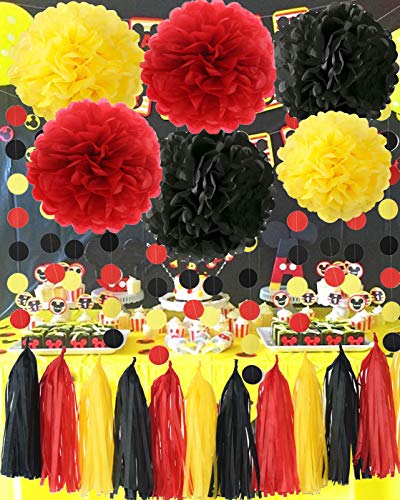 Décorations de fête jaune noir rouge Mickey Mouse Liste du paquet: 6 pcs fleurs en papier: 2 pcs jaune (1 * 12 pouces + 1 * 10 pouces); 1 paquet de gland de papier de soie de couleur mélangée jaune noir-rouge avec un ruban blanc et selon les instructions, total de 12 feuilles, chaque couleur comprenant 4 pcs. 2pcs jaune couleur noir rouge mélangé de guirlande de papier de point de cercle. Longueur de guirlande de papier: environ 6,5 pieds.