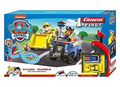 Ce jouet tiré de l’univers du dessin animé Sam le pompier a pour nom officiel : Racebaan 290 First Paw Patrol Double.