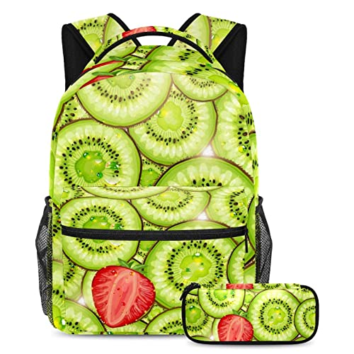 Sac à dos avec poches latérales pour bouteille et trousse à crayons, sac à livres pour adolescentes, filles, garçons, motifs fraises et kiwi, multicolore