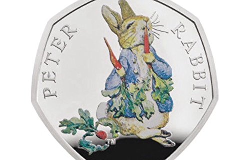 Ce jouet tiré de l’univers du dessin animé Pierre Lapin a pour nom officiel : The Great British Coin Hunt 2018 Peter Rabbit Munching argent reproduction (0.9250) COULEUR AUTHENTIQUE 50P pièce de monnaie.