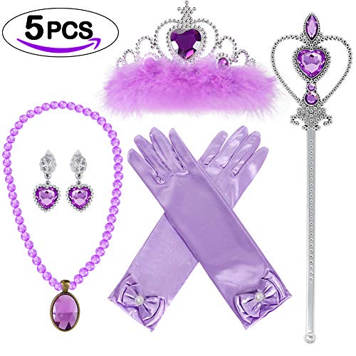VAMEI 5pcs Princesse Sofia Habiller Accessoires Set y Compris Sofia Collier Plume Tiara Couronne Baguette Magique Boucles d’oreilles Gants Violet pour Princesse Cosplay Déguisement pour Filles