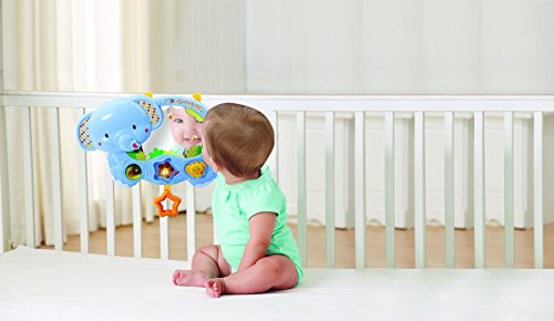 Magique, les personnages des P’tits Copains apparaissent dans le miroir façon hologrammes lorsque Bébé appuie sur le bouton lumineux !. . Une étoile à tirer pour déclencher des phrases, des chansons et pour voir les animaux apparaître à nouveau.. . L’étoile s’illumine au rythme de la mélodie pour bercer Bébé.. . Un balle remplie de petites billes à faire tourner et un papillon à manipuler pour déclencher des sons rigolos.. . 3 chansons et 10 mélodies.. . Se pose ou s’accroche au lit ou au parc grâce aux sangles ajustables.. . 2 en 1 : Bébé peut aussi jouer au sol.. . Réglage du volume sonore et arrêt automatique.Fonctionne avec 3 piles LR06 fournies.Miroir façon hologrammes lorsque bébé appuie sur le bouton lumineux
