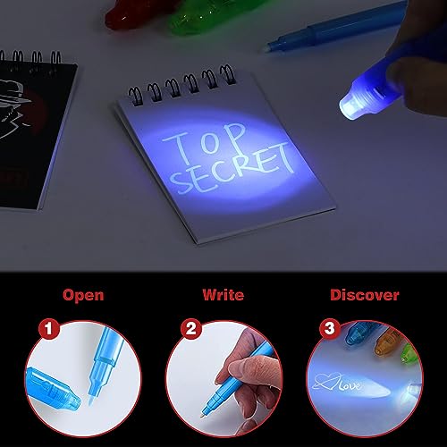 FAVEURS DE FÊTE UNIQUES – Les enfants peuvent utiliser le stylo invisible pour écrire leurs secrets sur le mini cahier, et l’encre magique cachera les secrets, le message ne peut être révélé que lorsque la lumière LED sur le capuchon du stylo est allumée. Utilisez la loupe pour ne manquer aucun indice. Laissez votre enfant être un petit détective heureux !