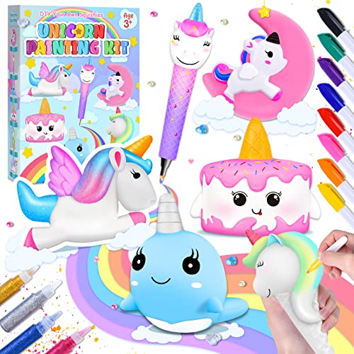Ensemble de peinture licorne : 6 squishy à montée lente (gâteau, cheval volant, étui à crayons licorne, baleine, glace et lune), stylo aquarelle 8 couleurs, 4 décorations scintillantes, 2 pierres précieuses scintillantes. Emballage de boîte de couleur exquis, très approprié pour la peinture créative de bricolage des enfants.