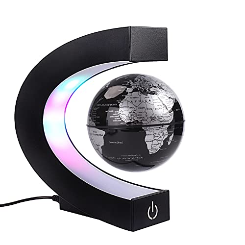 Ce produit tiré de l’univers du dessin animé Sid le petit scientifique a pour nom officiel : Globe flottant magnétique avec lumières LED colorées en forme de C – Anti-gravité – Carte du monde rotative pour cadeau à la maison, au bureau – Avec interrupteur – Noir.