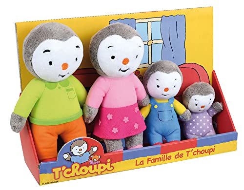 Il est constitué de 4 personnages représentant la famille de T’Choupi : T’Choupi +/- 12.5 cm, Fanni sa petite sœur +/- 9.5 cm, Malola sa maman +/- 17.5 cm et son papa Toine +/- 19 cm.