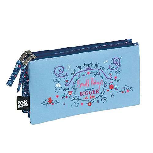 Trousse triple Magic things trousse triple magic est dé coré avec deux tissus diffé rents, l’ un bleu clair avec le slogan ë small things become bigger with loveé , avec des dé corations d’ animaux et de fleurs, et l’ autre bleu marine avec un imprimé floral de couleurs diffé rentes. il y a un dé tail d’ une fleur qui dé passe du tissu et les sangles des fermetures à glissiè re avec le mê me imprimé floral. et est que cette conception est faite avec amour et petits dé tails font unique.