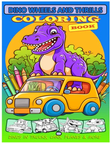 Le titre de ce livre tiré de l’univers du dessin animé Dino Train est : Dino Wheels & Thrills Coloring Book: 70+ Pages of Dinosaurs in Construction Trucks, Cars, Planes & More for Kids & Toddlers Ages 2-8 (Dinosaur Coloring Adventures).