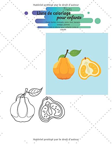 Le titre de ce livre tiré de l’univers du dessin animé Les kiwis est : Fruits Livre de coloriage pour enfants: Fruits faciles Grenade, poire, kiwi, banane, orange, pomme Livre à colorier pour enfants Livres à colorier.