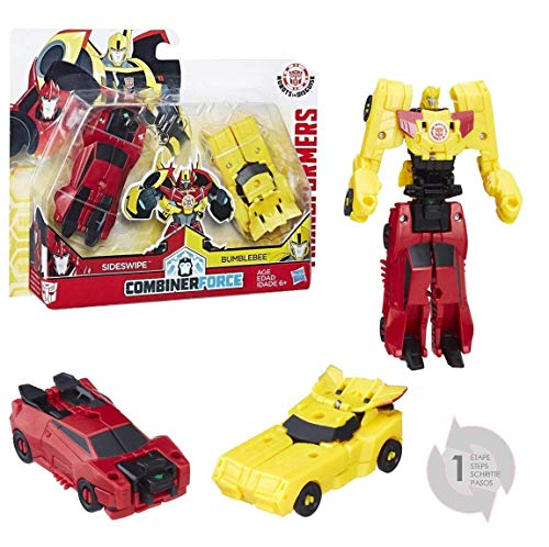 What happens when you crash and combine forces with Transformers robots in disguise Bumblebee and Sideswipe figures no not a traffic Jam You get a 2 bot beside crash Combiner figure this crash Combiner 2 pack features one Bumblebee figure and one Sideswipe figure Crash these figures together in one awesome step to form a beside Combiner robot Crash these figures with other crash Combiner figures to form different 2 bot combinations The Bumblebee figure and Sideswipe figure each convert from robot to sports car in 3 steps Scan the Autobot shield in Combiner mode to unlock the beside character in the mobile app When Bumblebee and Sideswipe combine they battle deception as an even more powerful robot beside Watch out Deceptions beside in pursuit combine forces and join the battle with these figures based on the robots in disguise animated series Crash and combine it s beside timeLes 2 personnages Transformers passent du mode robot au mode véhicule en 1 seule étape !