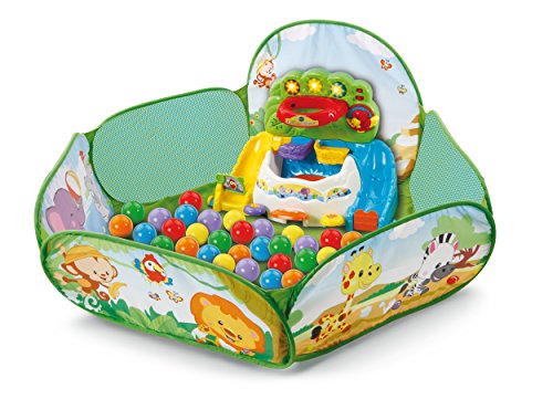 Ma piscine à balles interactive Pop Balles – 1 – 4 ans Bébé découvre un grand parc à balles joliment illustré pour apprendre en s’amusant. Bébé lance les balles dans le panier de basket, elles sont comptées et redescendent en musique. Trop rigolo : Bébé éjecte les balles en appuyant sur le gros bouton central. En appuyant sur les deux boutons latéraux, il peut aussi actionner 2 animaux rigolos comme dans un flipper pour faire glisser les balles sur les toboggans. 3 boutons lumineux pour découvrir les premiers chiffres, les couleurs et inciter Bébé à marquer des paniers. 3 modes de jeu : Chiffres, Animaux et Musique.. Taille de l’aire de jeu : 1000 x 1000 x 225 mm. 30 balles colorées incluses. La piscine est légère et se plie facilement pour rangement facile. 5 chansons et 15 mélodies. Boîte Try-me. Fonctionne avec 3 piles LR6 fournies.Parc à balles joliment illustré