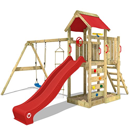 WICKEY Portique de jeux avec balançoire, toboggan, bac à sable et un kit d’accessoires complète