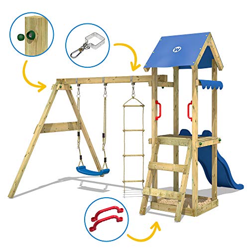 Ce jouet tiré de l’univers du dessin animé La maison de Mickey a pour nom officiel : WICKEY Aire de Jeux Portique Bois TinyCabin avec balançoire et Toboggan Vert Maison Enfant Exterieur avec bac à Sable.